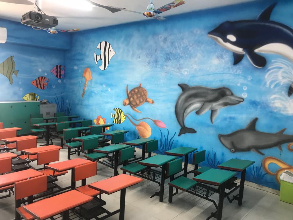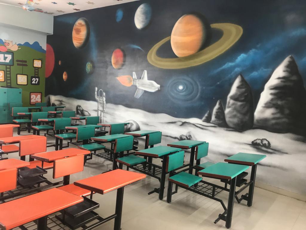 Storytelling is the oldest form of teaching. The children’s storytelling room at the South International School is designed to feel like you are entering a happy place. The wall paintings add beauty and a sense of well-being and growth. Throughout this room, the choice of color became an integral part of creating an exuberant, playful atmosphere into which children could escape to a world of imagination and learned experience.